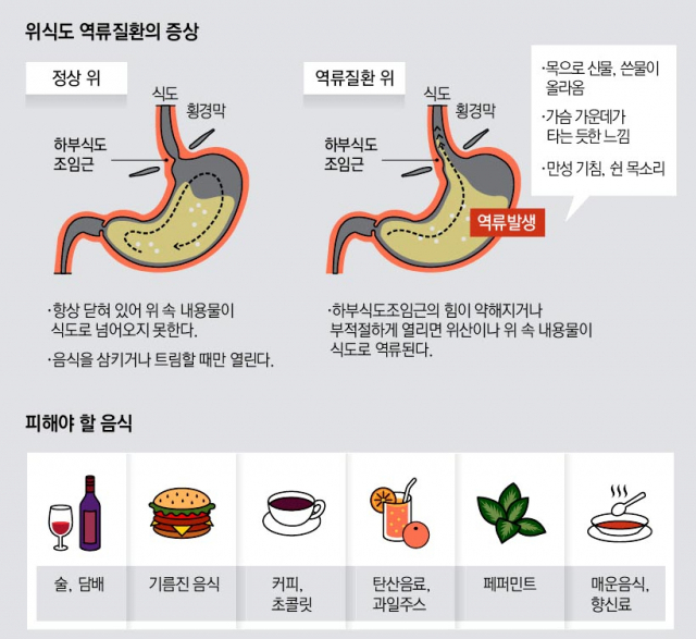 위식도역류는 하부식도 괄약근이 기능부전으로 인해 수축력이 약화되어 위의 내용물이 식도로 역류되는 것으로, 역류가 자주 발생하게 되면 합병증을 유발하게 되는 질환이다.